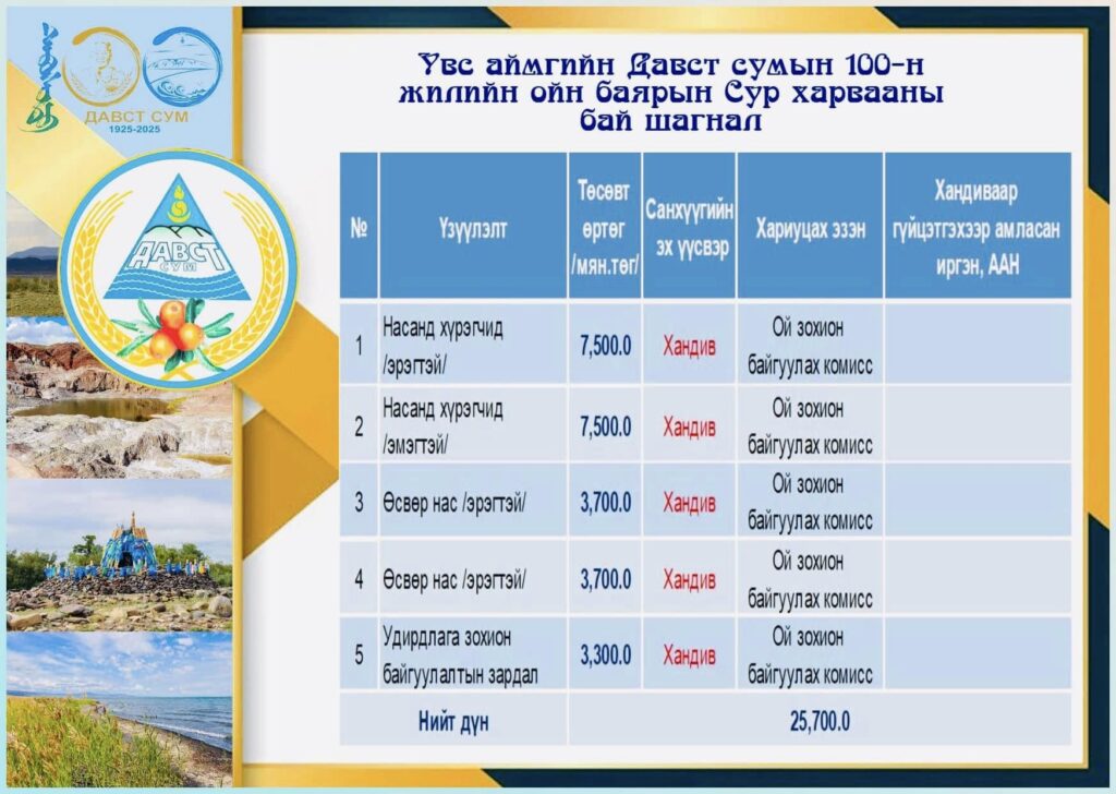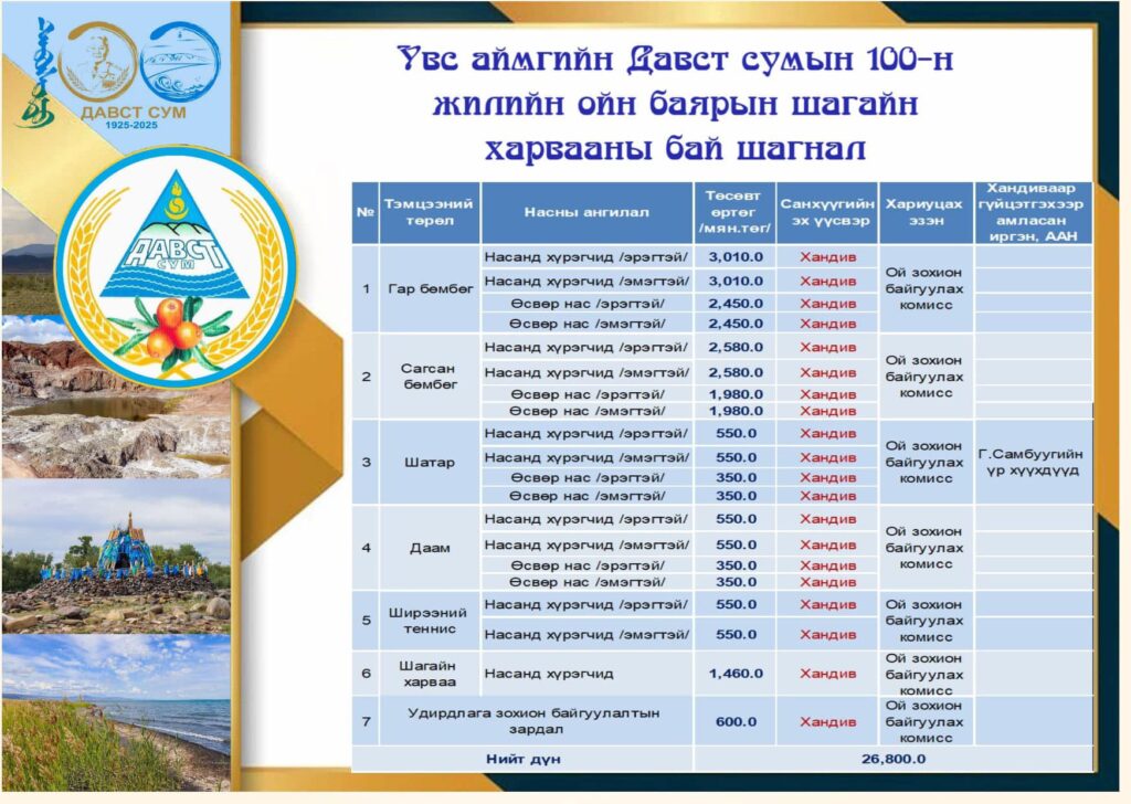 УВС АЙМГИЙН ДАВСТ СУМ 100 ЖИЛИЙН САНХҮҮГИЙН ЗАДАРГАА.