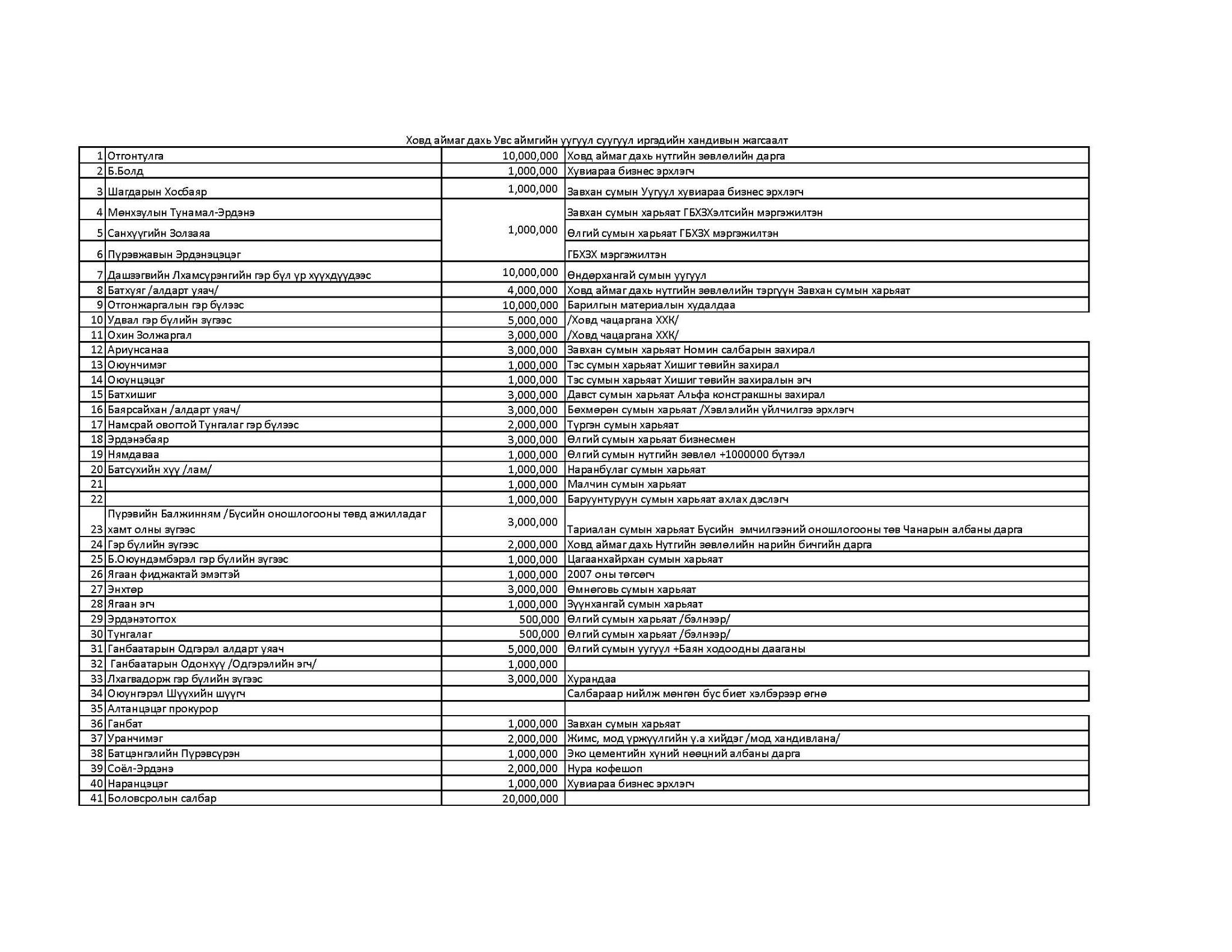 Тэд төрөлх нутгийнхаа түүхт ойгоор 20 сая төгрөг хандивласан бөгөөд УЛААН УУЛЫН тохижилтын ажлыг хийж гүйцэтгэхэд өөрсдийн үнэтэй хувь нэмэрээ оруулжээ.