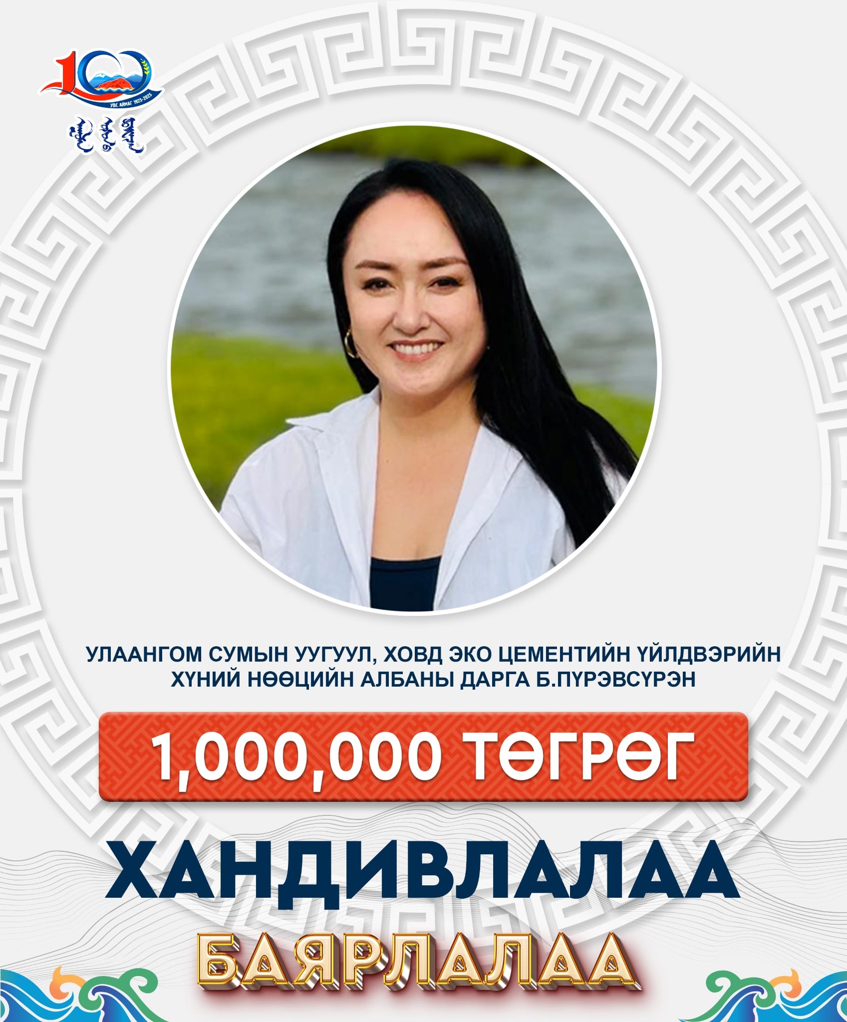 Төрөлх Увс аймгийнхаа түүхт ойн хандивын уулзалтад хүрэлцэн ирсэн Ховд Эко цемент үйлдвэрийн ХҮНИЙ НӨӨЦИЙН АЛБАНЫ ДАРГА Батцэнгэлийн ПҮРЭВСҮРЭН өөрийгөө товч танилцуулан гэр бүлийнхээ зүгээс 1 сая төгрөг хандивлалаа.