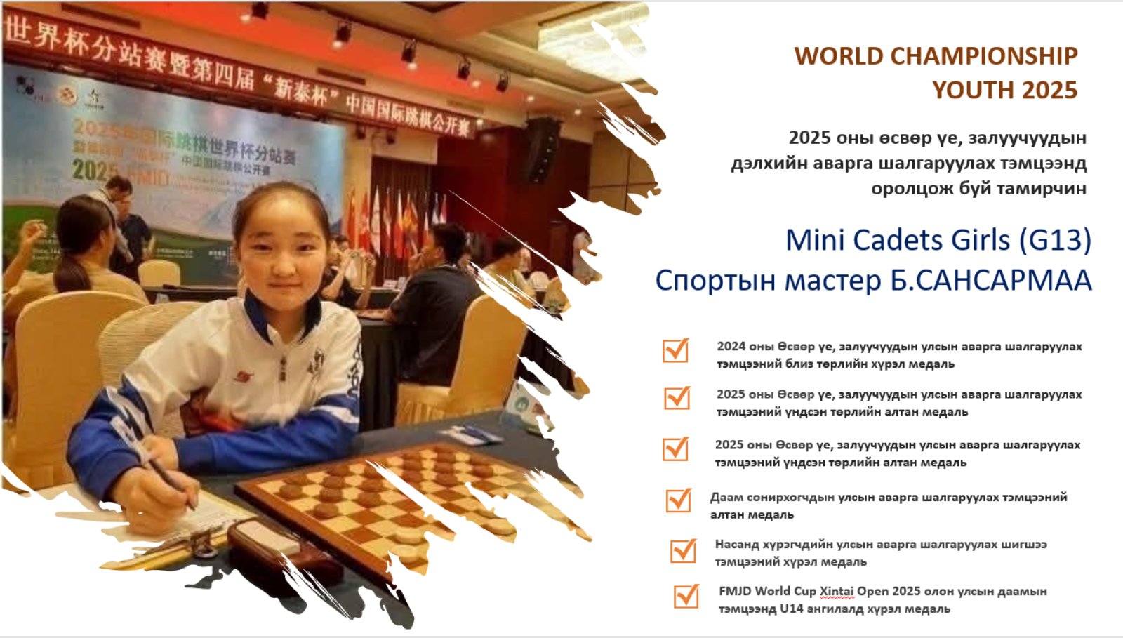 Энэ угталтын үеэр Увс аймгаас 100 буудалд даамны АНХНЫ дэлхийн аварга цолыг хүртсэн даамны спортын мастер Батмөнх овогтой САНСАРМАА нь: