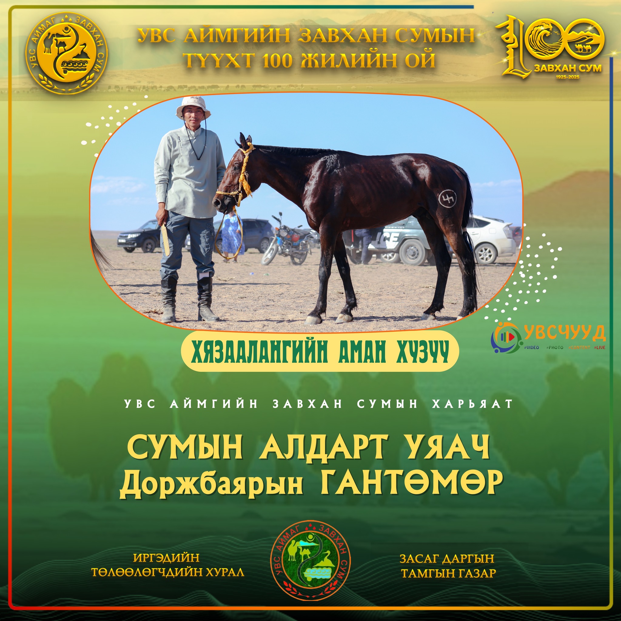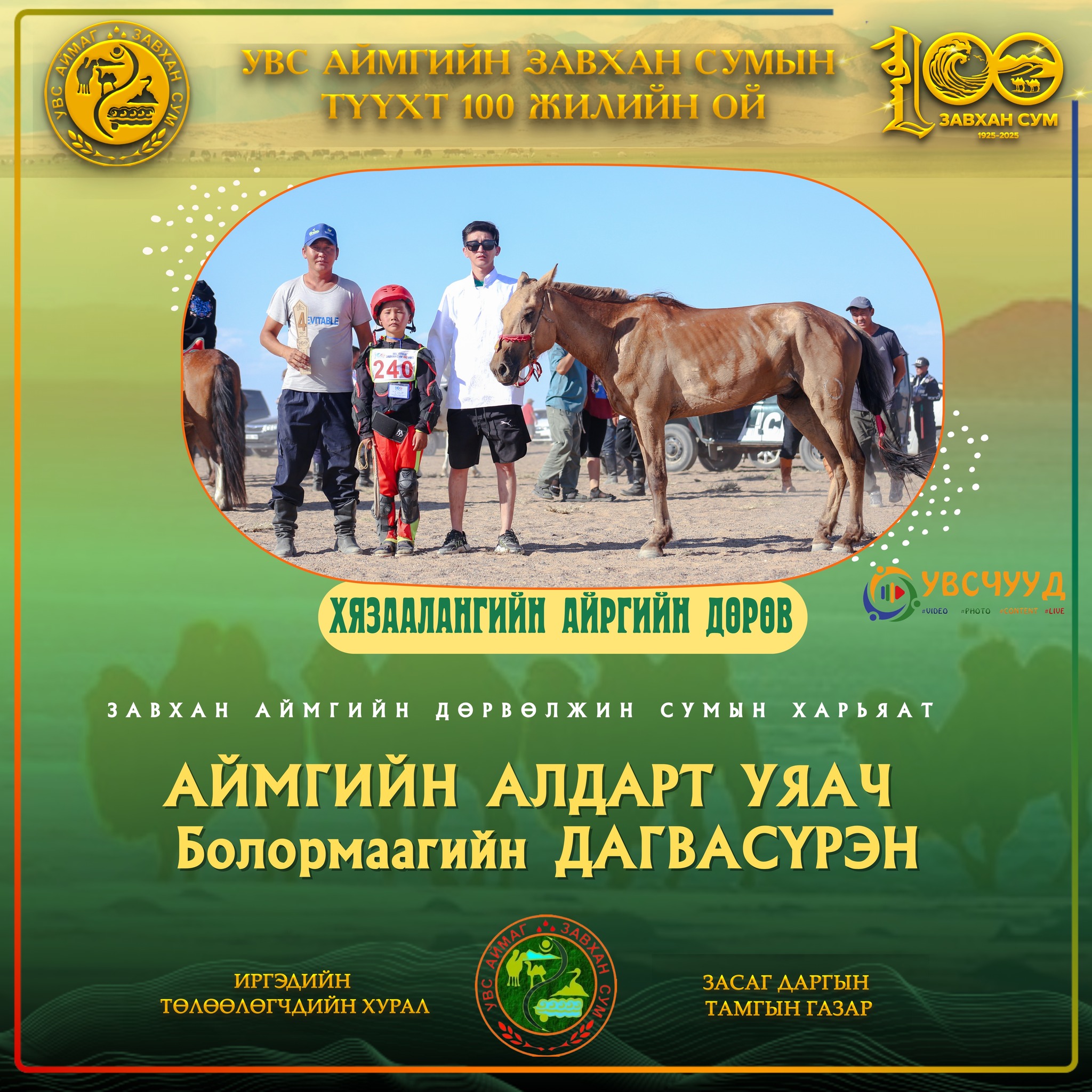 Түүхт 100 жилийн ойдоо амжилттай наадсан нийт уяачид болон унаач хүүхдүүдэд халуун баяр хүргэж, хүлэг бүрийнх нь босоо цагаан хийморь ивээх болтугай.