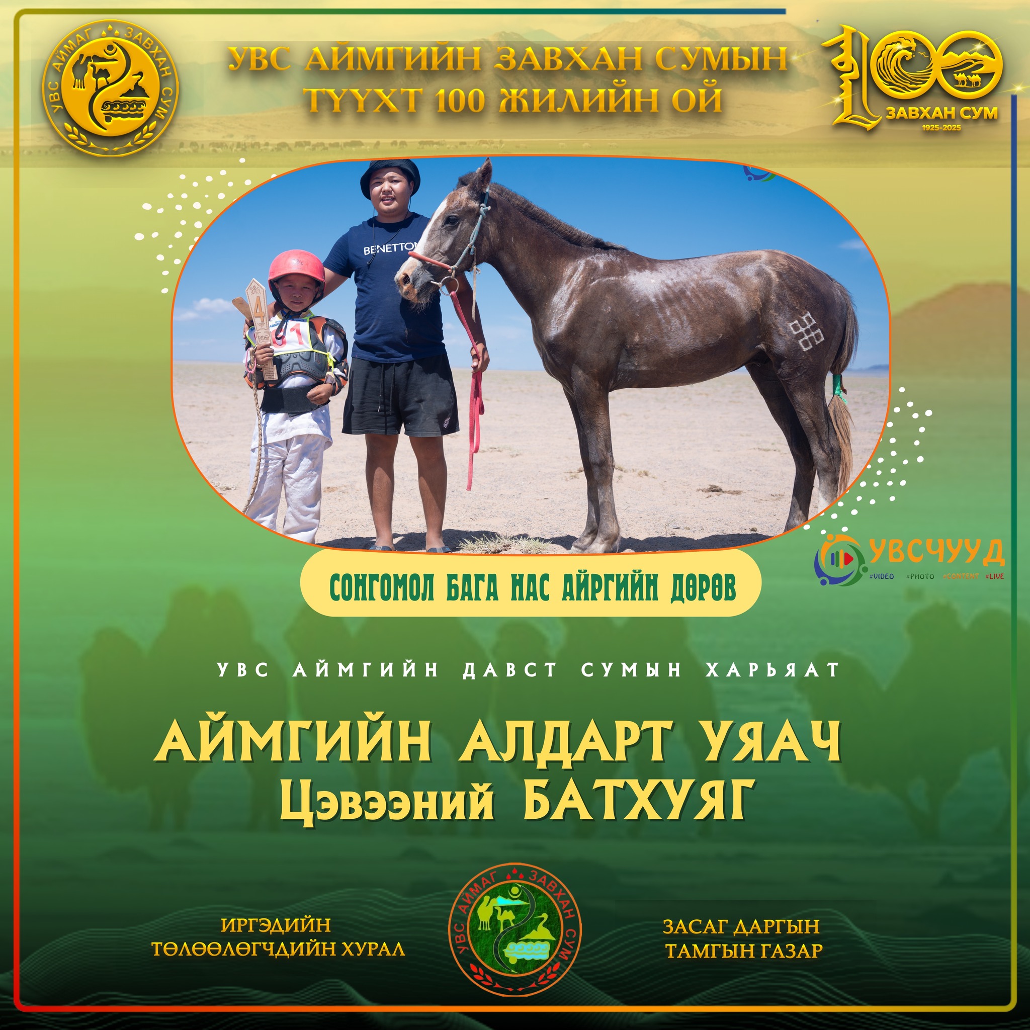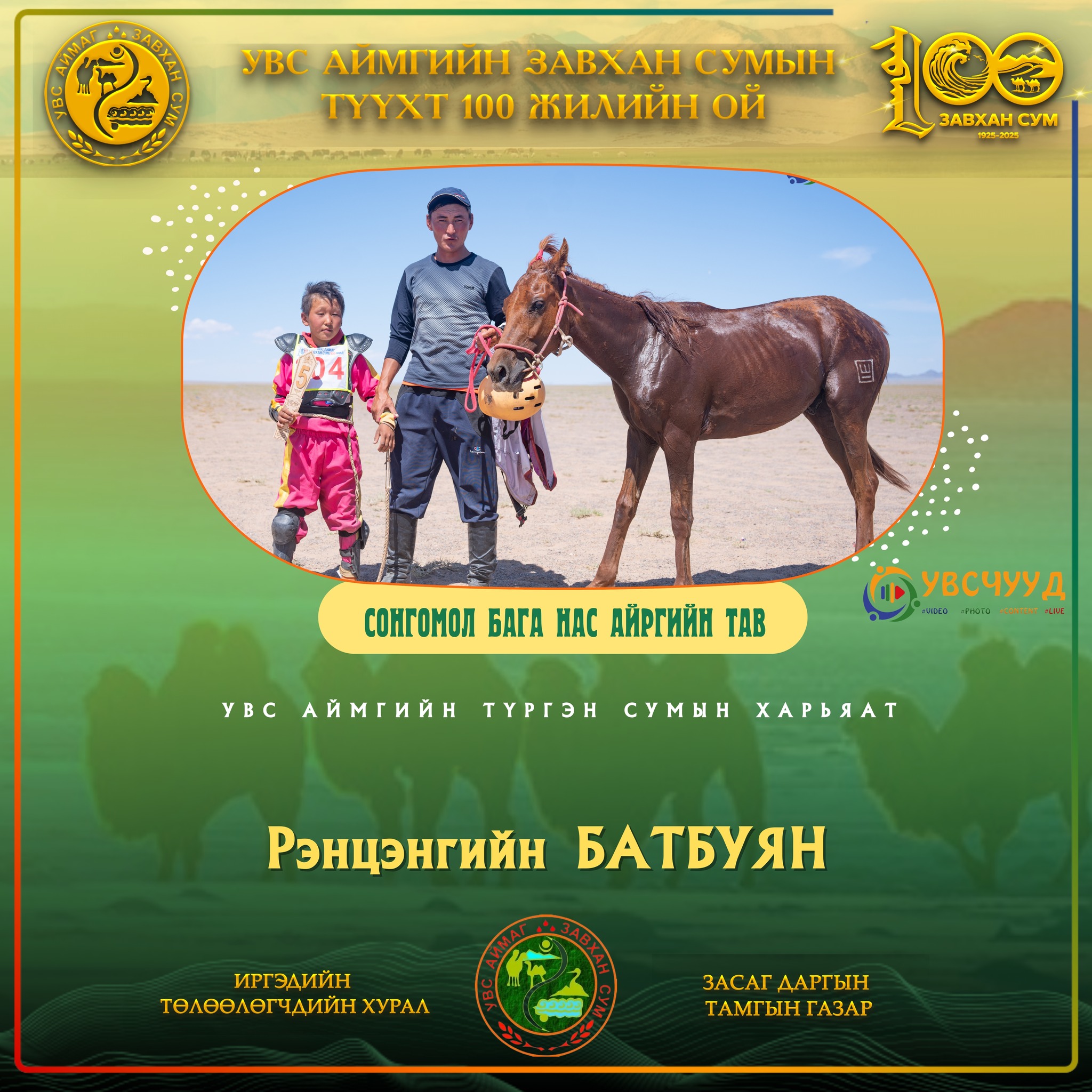 Түмэн тэмээт нутгийн түүхт 100 жилийн ой СОНГОМОЛ БАГА НАСНЫ уралдаанд 25 хурдан хүлэг мордосноос