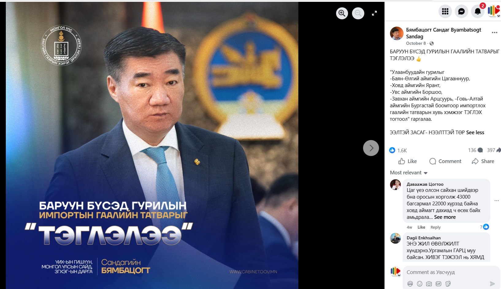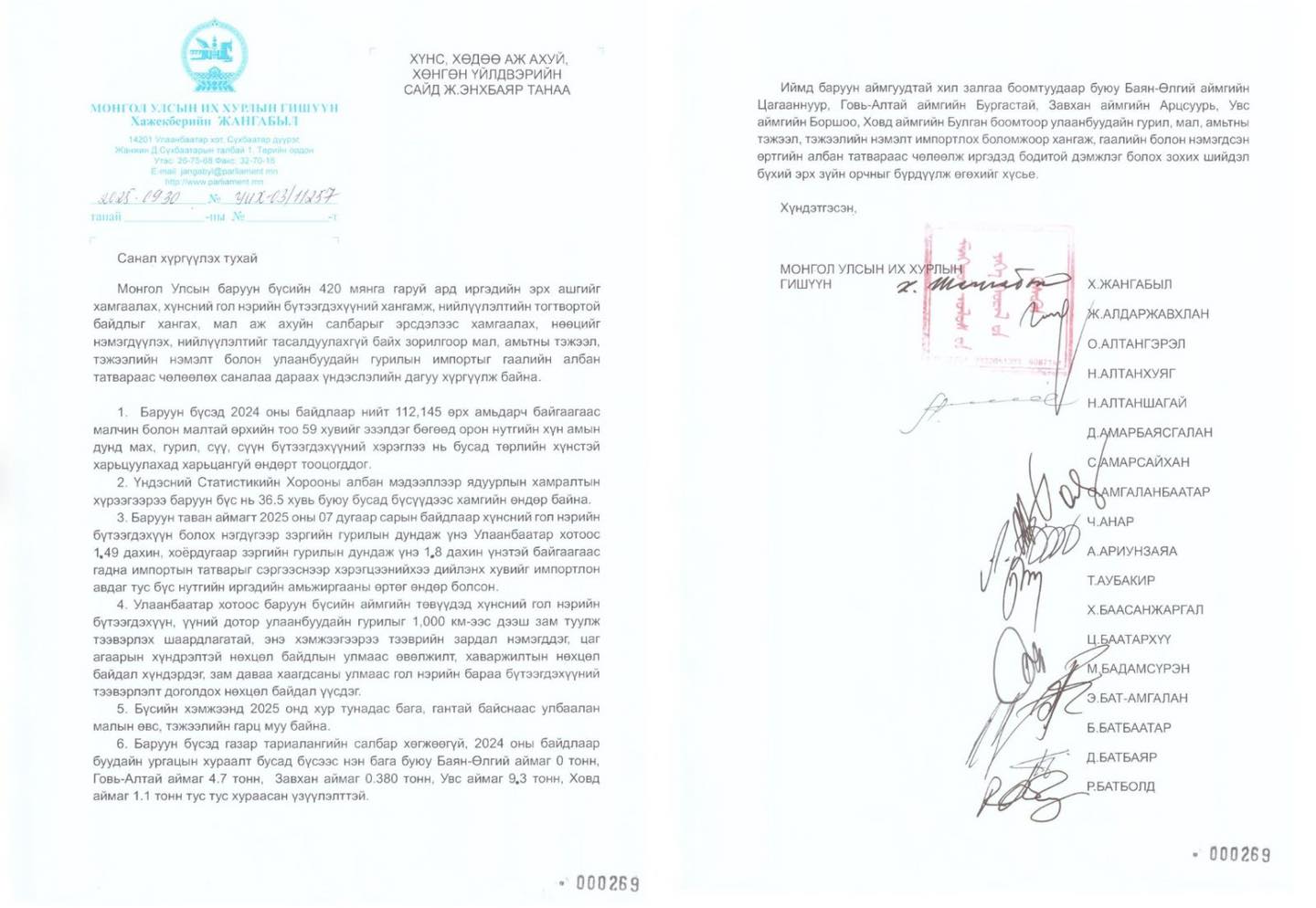 Уг үйл явдлыг хөөж үзвэл Баруун бүсээс сонгогдсон УИХ-ын гишүүдээс гаргасан “Баруун бүсийн боомтуудаар импортлох улаанбуудайн гурил, мал, амьтны тэжээл, тэжээлийн нэмэлтийг гаалийн албан татвараас чөлөөлөх” тухай саналыг Улсын Их Хурлын 64 гишүүн дэмжин гарын үсэг зурж, 2025.09.30-ны өдөр ХХААХҮ-ийн сайд Ж.Энхбаярт хүргүүлжээ.