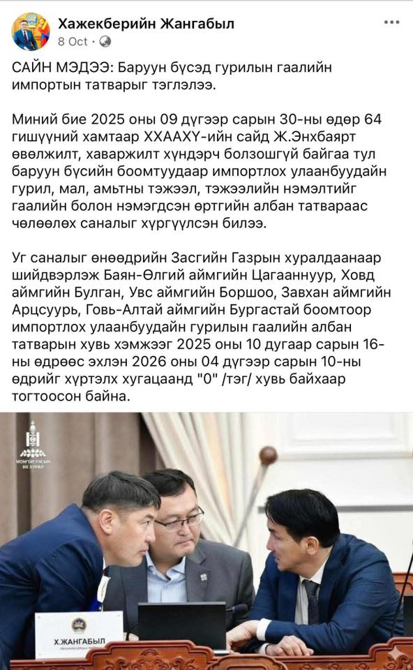 Улмаар Засгийн газрын 10 сарын 08 өдрийн хуралдаанаар уг саналыг хэлэлцэн дэмжиж, 2025.10.16-аас 2026.04.10 хүртэлх хугацаанд дараах боомтуудаар импортлох бүтээгдэхүүнд гаалийн татварыг “0” хувь болгох тогтоол баталжээ. Үүнд:
