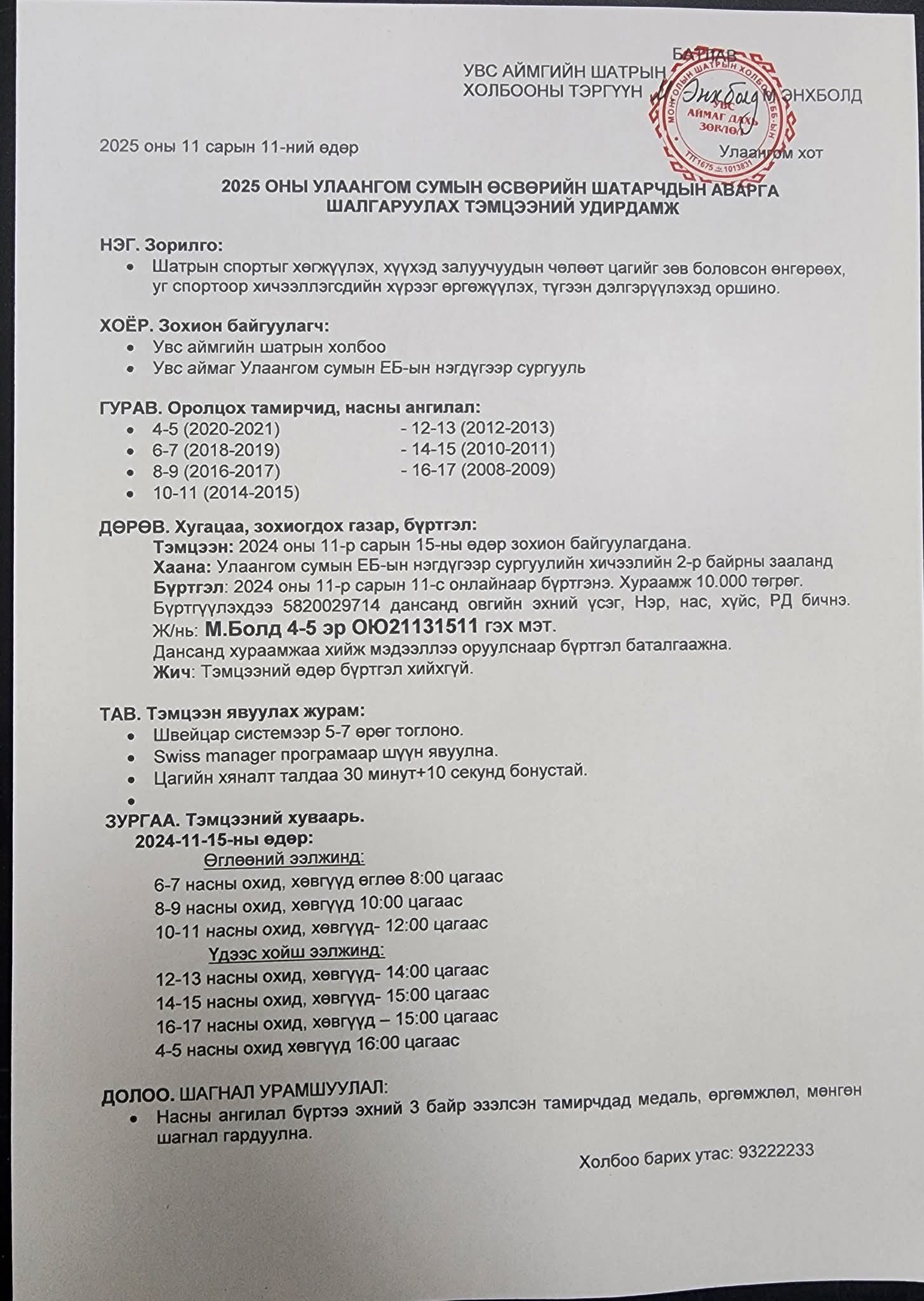 Тэмцээн 11 сарын 15 болох тул хүүхэд , залуучуудыг идэвхитэй оролцохыг уриалж байна.