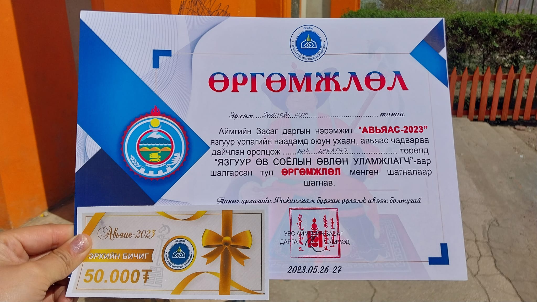 Увс аймгийн Засаг даргын нэрэмжит “Авьяас-2023” язгуур урлагийн наадамд оролцох багш, сурагчдын унааны зардалд Зүүнговь сумын Засаг дарга Б.Эрдэнэ-Очир 250.000 төгрөг, Соёлын төв 160.000 төгрөг, Эцэг ,эх асран хамгаалагч – 170.000 төгрөг хандивлаж бяцхан авьяастнуудаа дэмжиж байв.