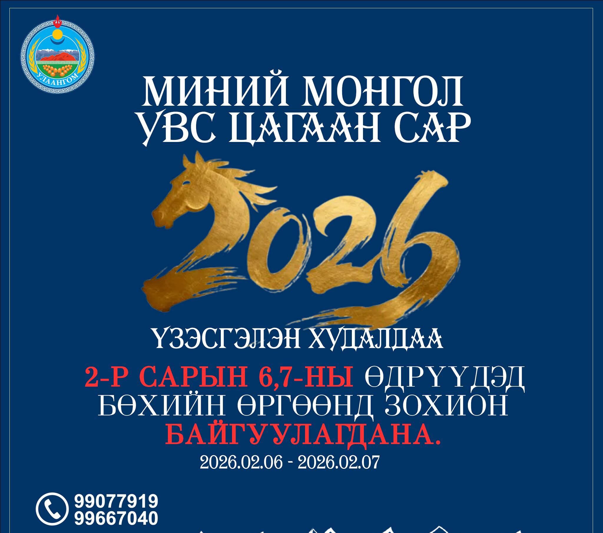 Увс аймгийн аж ахуйн нэгж болон иргэдийн үйлдвэрлэсэн бүтээгдэхүүн, үйлчилгээг сурталчлах, борлуулалтыг нь дэмжин орлогыг нэмэгдүүлэх, зах зээлийн холбоо тогтооход туслах, урамшуулан хөгжүүлэх зорилгоор “МИНИЙ МОНГОЛ-УВС ЦАГААН САР 2026” үзэсгэлэн худалдааг 2026 оны 2 дугаар сарын 6, 7-ны өдрүүдэд Бөхийн өргөөнд зохион байгуулна.