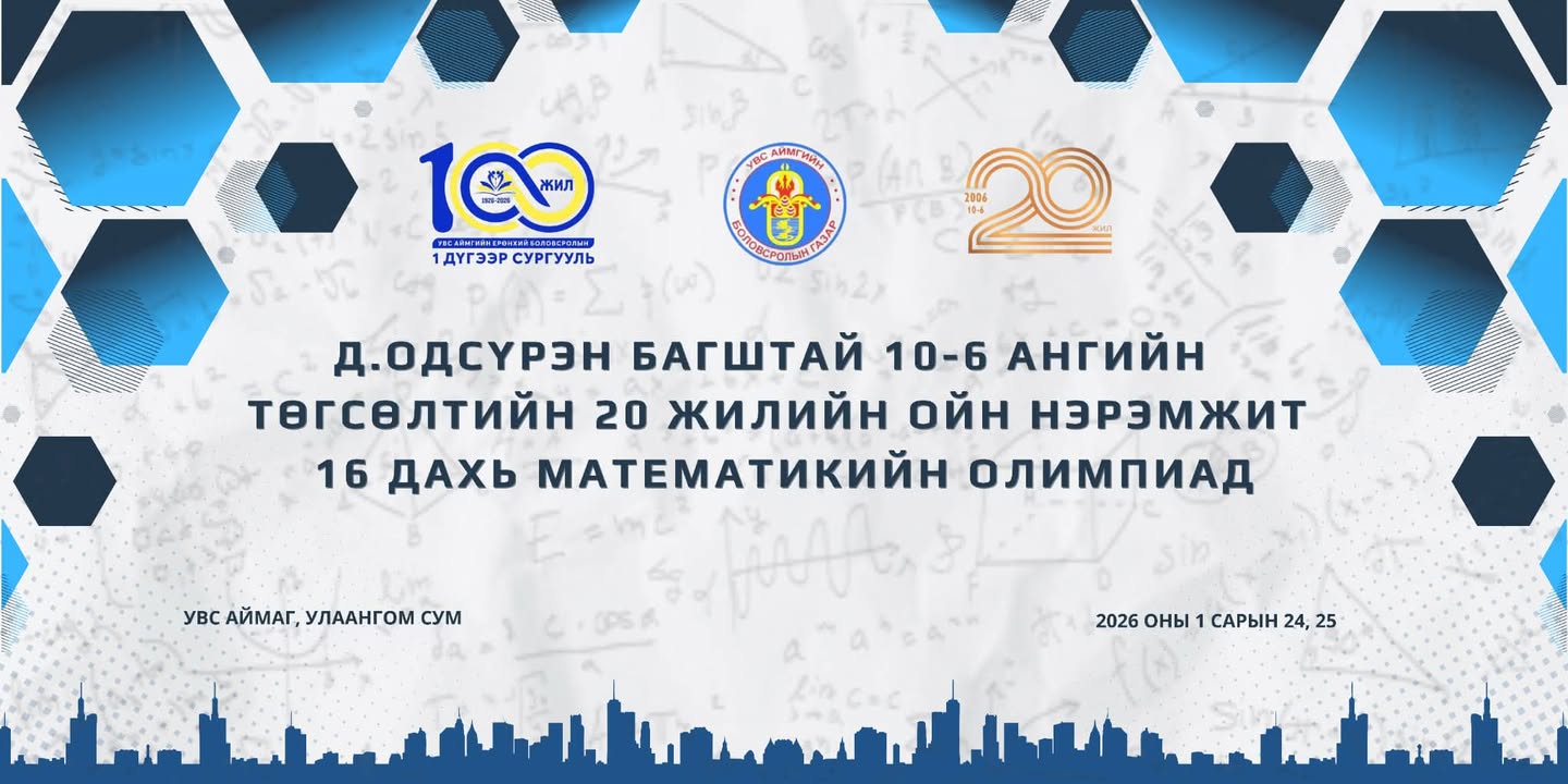 Увс аймгийн Улаангом сумын ЕБ-ын нэгдүгээр сургуулийн 2006 оны Д.Одсүрэн багштай 10-6 ангийн төгсөлтийн 20 жилийн ойн нэрэмжит “МАТЕМАТИКИЙН XVI ОЛИМПИАД”-ыг 2026 оны 1 сарын 24,25ны өдрүүдэд зохион байгуулагдана.